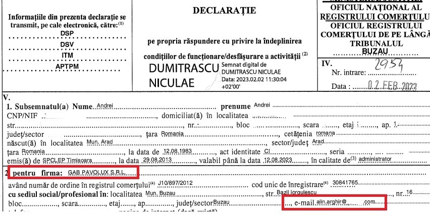El a afirmat că a trecut prea mult timp și acum nu mai știe numele persoanei care l-a contactat în octombrie 2022 pentru schimbările la firma din Buzău. În documentele din ”era” Andrei Andrei de la Registrul Comerțului Buzău, documente consultate de G4Media.ro, drept contact al firmei Gab Pavolux SRL apare și adresa de email alin.arghir@(….)com.
