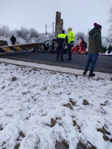 Din informațiile transmise de la fața locului, grinda porții de gabarit a fost smulsă de pe poziție, iar în momentul prăbușirii de pe reazeme a acroșat un autoturism, accidentul rutier soldându-se cu victime.