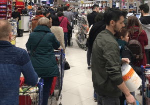 Bucureștenii s-au îngrămădit și la supermarketurile de cartier, cozile devenind din ce în ce mai mari după ora 18. Produsele alimentare cele mai căutate sunt conservele, precum și produsele făinoase.