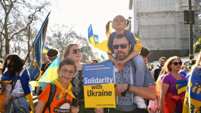 O mulțime uriașă de oameni, inclusiv ucraineni care trăiesc în Marea Britanie, politicieni și celebrități, au mărșăluit prin Londra în semn de solidaritate cu Ucraina.