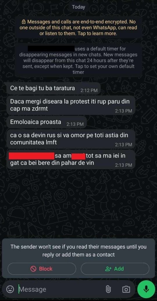 Unul dintre organizatori, Georgiana Budău, a declarat vineri, pentru Agerpres, că primul mesaj de ameninţare cu moartea a venit pe telefonul unei colege care este iniţiatoare a manifestaţiei.