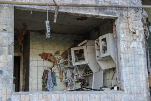 Oleh Sheremet, un electrician în vârstă de 57 de ani, poate vedea de pe stradă ce a mai rămas din bucătăria lui. Nu mai există sticlă sau rame de ferestre.