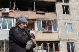 Larysa Lupych o ține în brațe pe Kindie, una dintre cele trei pisici ale sale, în fața casei sale din Kiev, la 19 martie 2022, la șase zile după ce aceasta a fost lovită de o rachetă rusească.