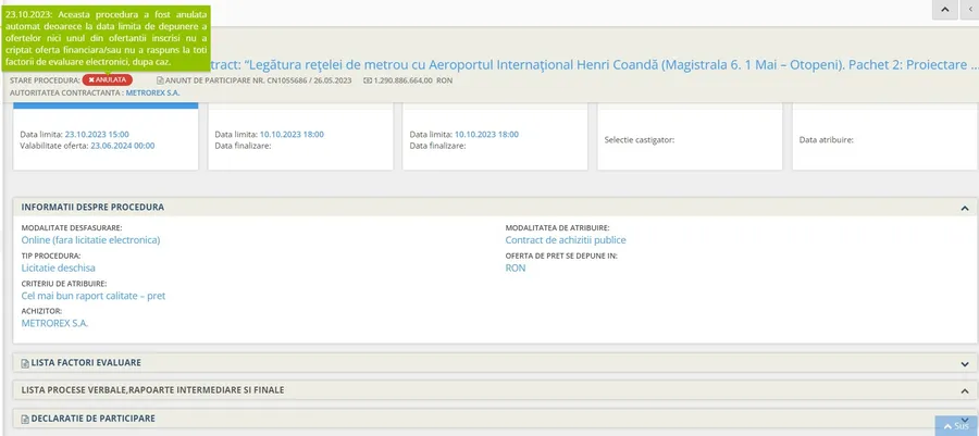 Punct și de la capăt la contractul pentru lucrările de arhitectură, șină și instalații ale Magistralei M 6 Gara de Nord-1 Mai, contract de 1,3 miliarde lei esențial pentru punerea în funcțiune a liniei la termenul promis : decembrie 2027. Luni, 23 octombrie, Metrorex a anulat licitația pentru atribuirea contractului de arhitectură, șină și instalații pe ambele secțiuni ale M 6, la termenul-limită neavând nicio ofertă depusă. Inițial, constructorul Gulermak (de pe secțiunea II) a depus contestație la CNSC, dar a retras contestația exact în ziua desemnării directorului general, Mariana Miclăuș pentru un mandat plin de 4 ani. Înainte de relansarea licitației, Metrorex va analiza dacă nu a primit oferte din cauza caietului de sarcini sau a valorii din contract de 1,3 miliarde de lei care ar putea fi suplimentat pentru a acoperi costurile actualizate