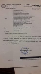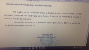 1. Foto 1-președinta ANAF, Mihaela Triculescu, solicită direcțiilor din ANAF să comunice dacă între direcțiile respective și SRI a existat vreun protocol de colaborare.