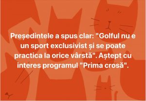 Va îndemnat preşedintele să faceţi sport şi gata v-aţi şi văzut participând la marile concursuri de golf. Uşor nu săriţi aşa ! Mai întâi trebuie să daţi burta jos altfel trebuie crose care să acolească curbura burţii şi eu încă nu am văzut. Da e adevărat că nu este un sport exclusivist dar pentru cei care fac sport numai prin tribune pare o declaraţie aşa ca o bătaie de joc. Aşa că nu mai daţi cu bâta-n baltă pe aici !