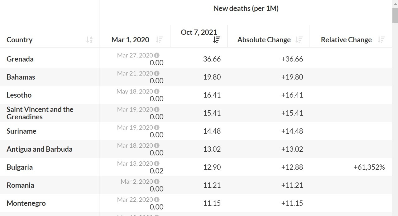 În 7 octombrie, Bulgaria a înregistrat 12,9 decese la un milion de locuitori, iar România – 11,21 la un milion de locuitori.