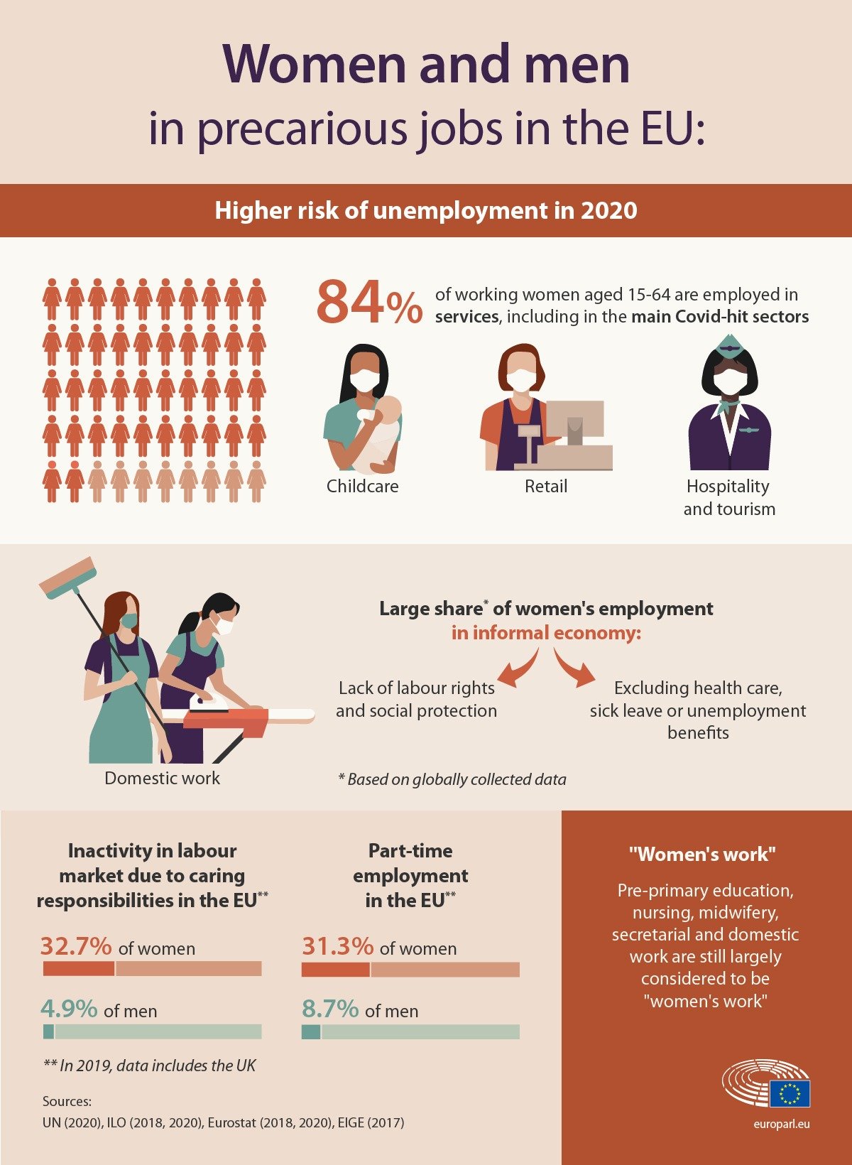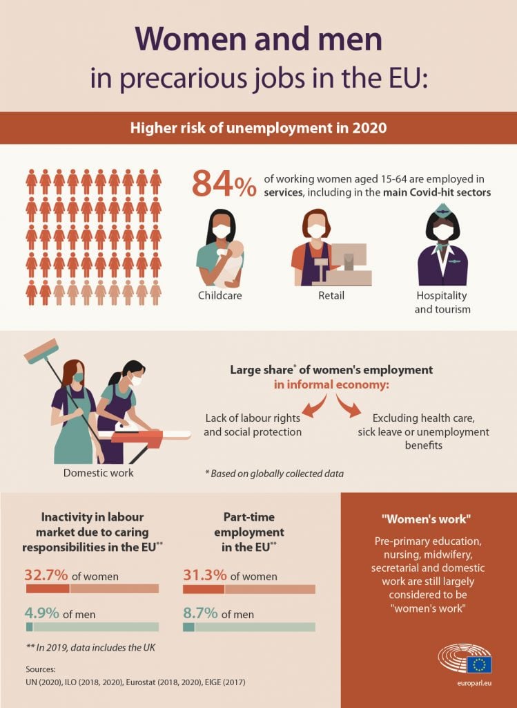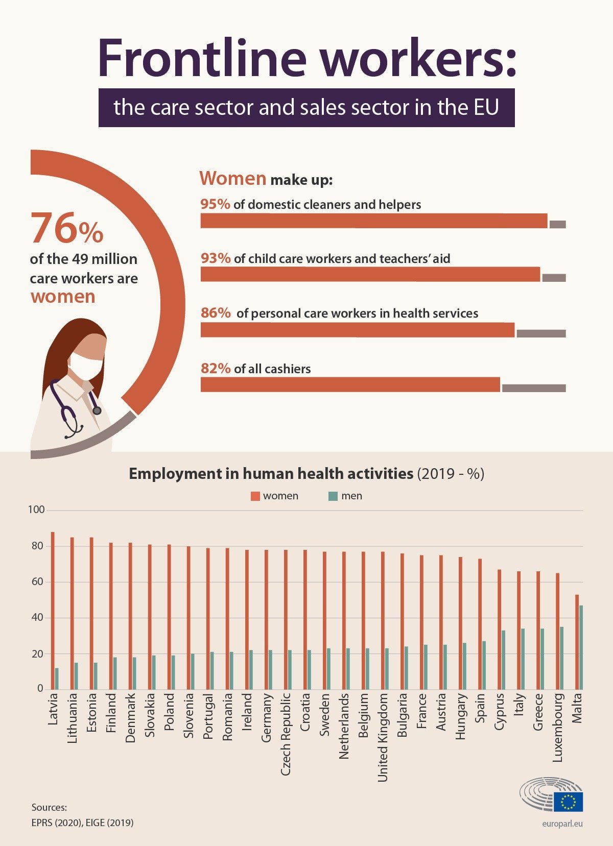 Din cele 49 de milioane de angajați din Uniunea Europeană care s-au aflat în prima linie în timpul pandemiei de COVID-19, fiind cei mai expuși la virus, aproximativ 76% sunt femei, arată o sinteză a Parlamentului European care analizează impactul COVID-19 asupra femeilor. În timpul pandemiei, multe femei și-au pierdut locurile de muncă, în timp ce numărul cazurilor de violență domestică a crescut.