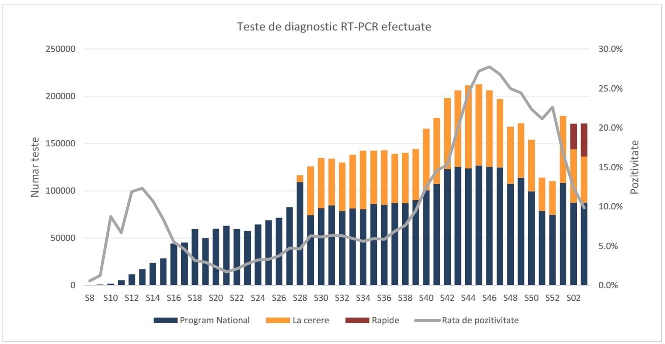 Mai mult de o treime din cazurile de COVID de săptămâna trecută s-au înregistrat în București, Timiș, Cluj, Ilfov și Iași. Circa 170.000 de teste au fost realizate, cu o rată de pozitivare de 10%, potrivit raportului săptămânal al Institutului Național de Sănătate Publică (INSP).