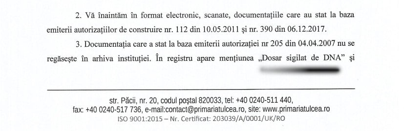 Primăria Tulcea ne-a transmis că autorizația de construire a imobilului lipsește din arhivele instituției, cu mențiunea că ”dosarul a fost sigilat de procurorii DNA”, în anul 2017. De precizat este că DNA ia foarte rar documente originale și, în orice caz, în locul lor este lăsată o copie, susțin sursele judiciare consultate de Info Sud-Est.