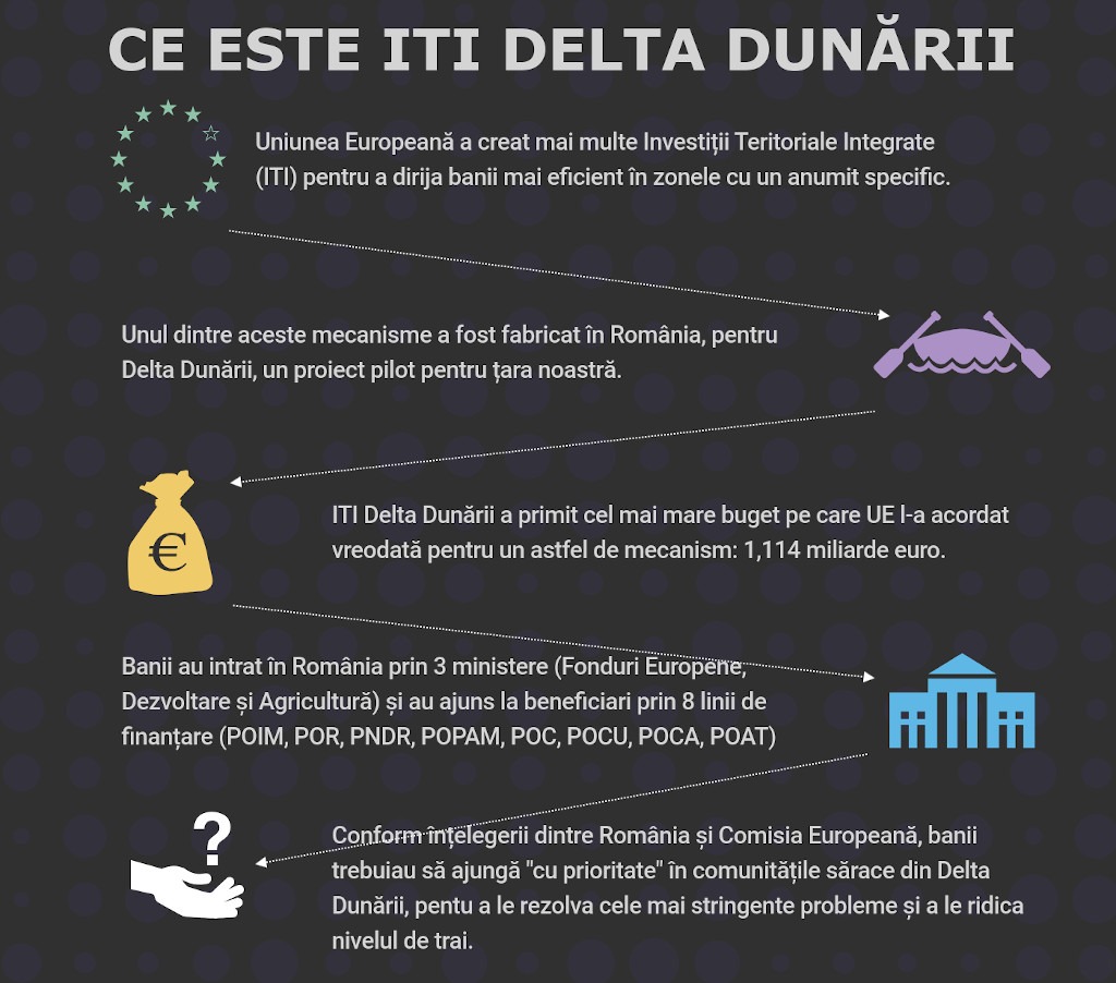 UE a creat mecanismul Investițiilor Teritoriale Integrate (ITI) pentru a ajuta regiunile cu un anumit specific să atragă bani europeni mai ușor. ITI Delta Dunării a fost proiectul pilot din România, construit pentru una dintre cele mai sărace și mai puțin populate regiuni din Europa. Delta Dunării a fost împărțită în zona umedă și cea de uscat, iar banii ar fi trebuit să ajungă cu prioritate în baltă, acolo unde nivelul de trai este foarte scăzut, iar iarna oamenii sunt izolați complet.