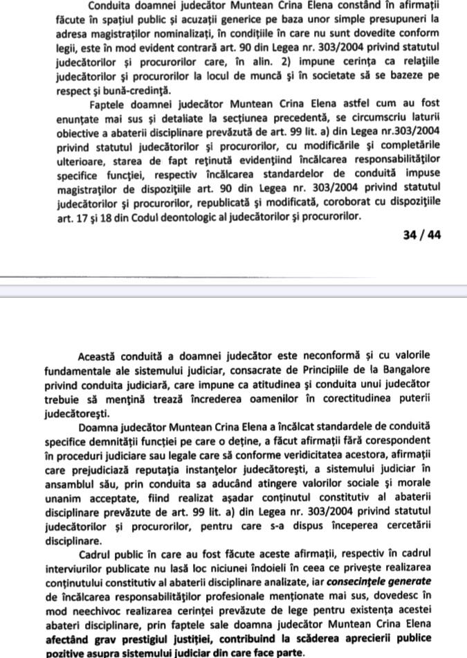 Judecătoarea Muntean a fost găsită vinovată pentru ”manifestări care aduc atingere onoarei sau probității profesionale ori prestigiului justiției, săvârșite în exercitarea sau în afara exercitării atribuțiilor de serviciu”.