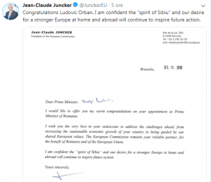”Sunt convins că spiritul de la Sibiu şi dorinţa noastră pentru o Europă mai puternică acasă şi peste hotare vor continua să vă inspire acţiunile viitoare”, se mai spune în scrisoarea al cărui text Juncker l-a postat pe contul său de Twitter.