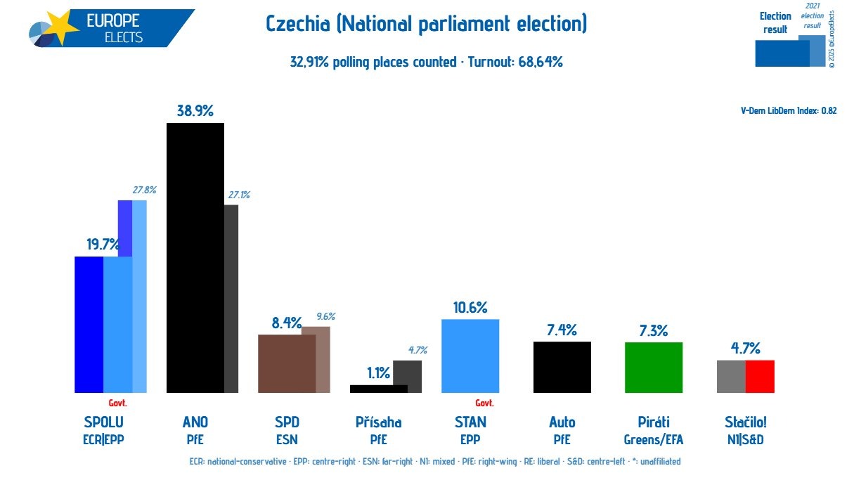 Pe locul doi s-a clasat cu 23,2% coaliția politică reprezentată de premierul Petr Fiala, SPOLU, în timp ce stânga reprezentată de Stačilo! (”A fost destul!”) n-a intrat în Parlament, obținând doar puțin peste 4% din voturile cehilor.