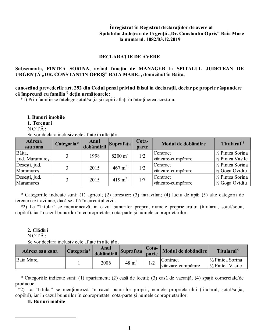 În documentul semnat la 3 decembrie 2019 și care a fost publicat pe site-ul Spitalului Județean de Urgență ”Dr. Constantin Opriș” din Baia Mare, unde Sorina Pintea a revenit în calitate de manager al instituției medicale, sunt menționate terenuri intravilane în suprafață de aproape un hectar, un apartament, dar și datorii de 150.000 de euro.