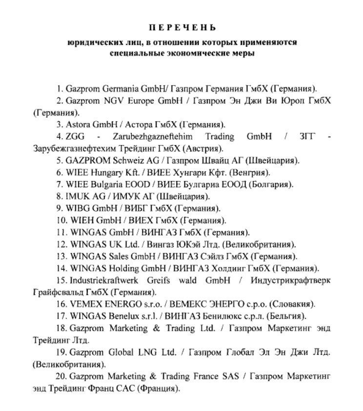 Decretul interzice în mod explicit exportul de produse și materii prime către persoanele și entitățile de pe listă. Agenția de știri Interfax din Rusia a declarat că acestea includ proprietarul polonez al conductei EuRoPol Gaz, Gazprom Germania și 29 de filiale Gazprom Germania din Elveția, Ungaria, Marea Britanie, Franța, Bulgaria, regiunea Benelux, Statele Unite, Elveția, România și Singapore.
