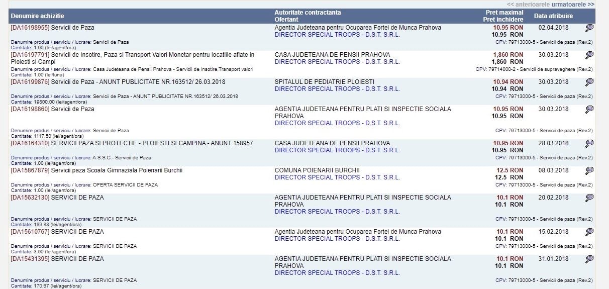 Firma de pază și protecție are însă zeci de contracte încredințate prin cumpărare directă cu zeci de instituții din Prahova precum Agenția Județeană pentru Ocuparea Forței de Muncă Prahova, Casa Județeană de Pensii Prahova, Spitalul de Pediatrie Prahova, Agenția Județeană pentru Plăți și Inspecție Socială Prahova, Spitalul C.F. Ploiești, Muzeul Județean de Istorie și Arheologie Prahova, etc.