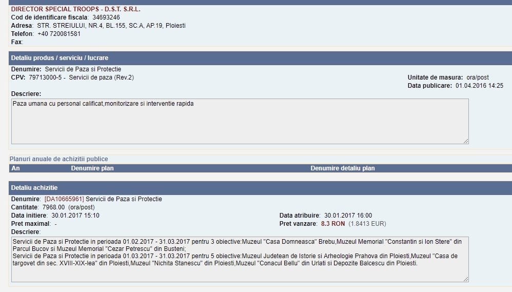 Potrivit SEAP, la data de 29 septembrie 2017, compania de pază și protecție Director Special Troops – D.S.T. S.R.L. a încheiat un contract acord cadru cu Romsilva – Direcția Silvică Prahova, pentru servicii de pază pentru 4 ani la făzănăria din Gherghița. Valoarea contractului este peste 50.000 de euro. Acest contract este singurul (care figurează în SEAP) atribuit prin licitație deschisă.