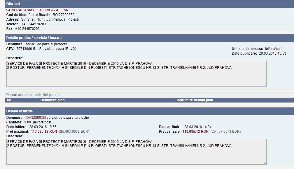 Precum DST, și GAL figurează cu zeci de contracte atribuite prin cumpărare directă cu instituțiile publice din Prahova. De exemplu, la data de 29 mai 2017, General Army Legione a încheiat, prin încredințare directă, un contract pentru servicii de pază cu Spitalul județean de urgență Ploiești în valoare de aproape 50.000 de euro, potrivit SEAP.