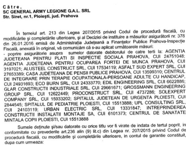 Cea mai palpabilă legătură dintre GAL și Cosma sunt însă contractele dintre firma de pază și companiile din siajul familiei Cosma și al lui Sebi Ghiță, după cum reiese dintr-un document al ANAF prin care, în 2016, s-a pus poprire pe sumele pe care GAL trebuia să le primească de la clienți. Aflăm astfel că printre clienții GAL se numărau Conti SA, Glar Construct, Eco Burn sau Grossmann Engineering.