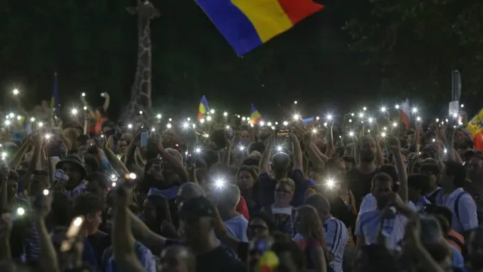 20.55 – Peste 35.000 de protestatari în Piața Victoriei. Oamenii au aprins lanternele telefoanelor mobile. Pe clădirile din proximitate sunt proiectate mesaje cu laser