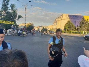 19:53 – Protestatarii au oferit trandafiri albi forțelor de ordine. Unul dintre jandarmi și-a pus trandafirul la centură