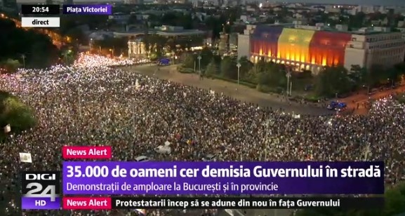 20:45 – În Piața Victoriei sunt peste 30.000 de oameni. Numărul protestatrilor din țară crește exponențial și în marile orașe: Sibiu – 5.000, Cluj-Napoca – 3.000, , Brașov – 2.500, Iași – 3.000, Constanța – 1.100, Timișoara – 1.500 (sursa: Digi24).