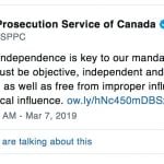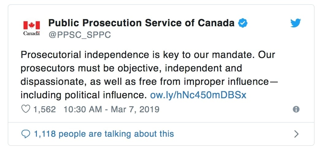 La scurt timp după remarcile făcute joi de Trudeau, Biroul Procuraturii Publice Generale din Canada (PPSC) a postat un mesaj tweet în care a scris: „Procurorii noștri trebuie să fie obiectivi, independenți și imparțiali, precum și liberi de influență necorespunzătoare – inclusiv de interferențe politice.” De asemenea, PPSC a spus că „independența organelor procuratorii este cheia mandatului nostru”.