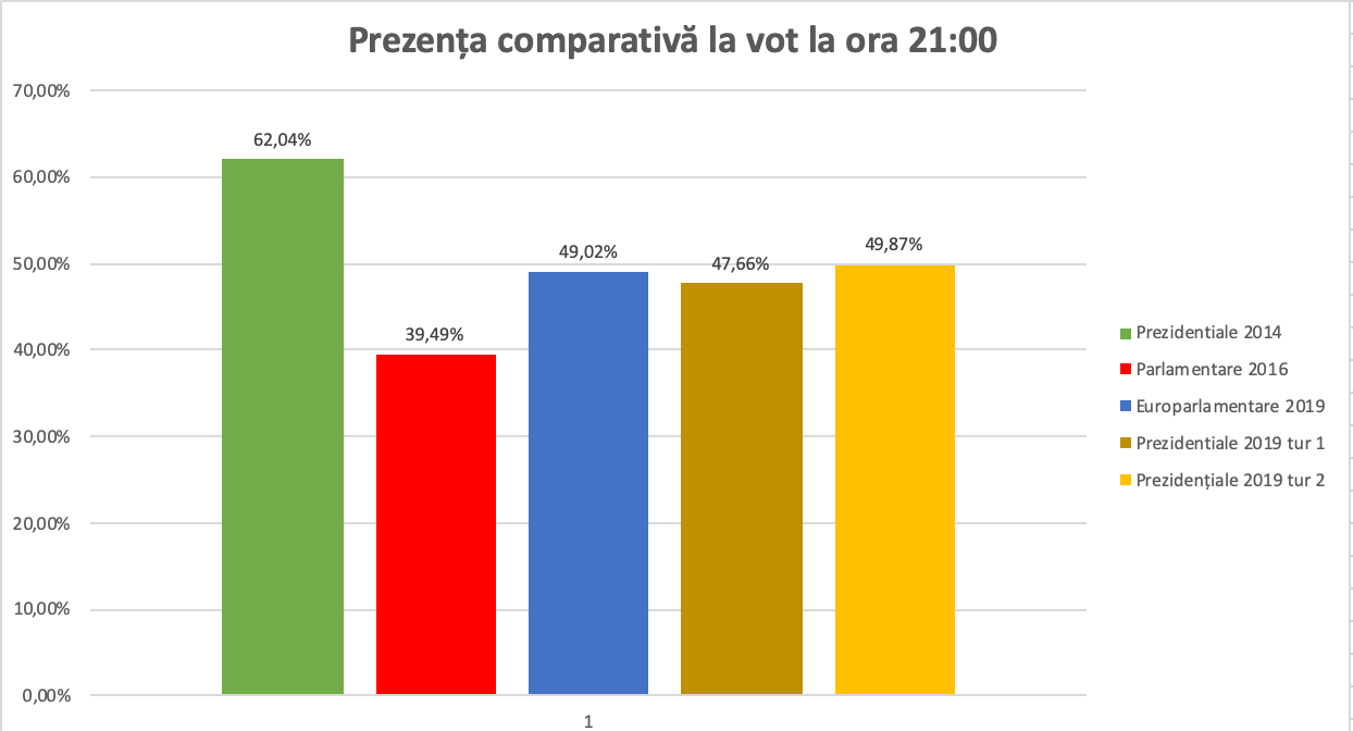 Prezența finală la vot în momentul închiderii urnelor în țară a fost de 49,87%, un număr total de 9.086.098 alegători prezentându-se la secțiile de votare. O prezență peste cea din turul întâi și de la europarlamentare, dar cu peste 12% mai mică decât cea din turul 2 al prezidențialelor din 2014.