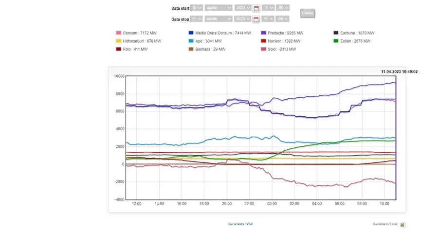 Astfel, la ora 10.50, potrivit datelor interactive Transelectrica, se produceau 9.285 MW, din care 2.113 MW plecau la export, adică 20% din toată producția. Doar 7.000 de MW sunt pentru consumul intern. Pe primul loc în sursele de producție este energia hidro, cu 3.041 MW, urmată de energia eoliană, cu 2.646 MW. Este multă apă de uzinat la Hidroelectrica, datorită precipitațiilor abundente, și bate și vântul, în așa fel încât aproape toate morile de vânt produc energie (circa 3.100 MW capacitate instalată în eolian). Practic, cele două surse „verzi” acontează aproape două treimi din toată producția de energie a României. Abia pe locul trei la producție găsim energia nucleară, care merge în bandă, la circa 1.400 MW, apoi cărbunele, hidrocarburile și fotovoltaicul.