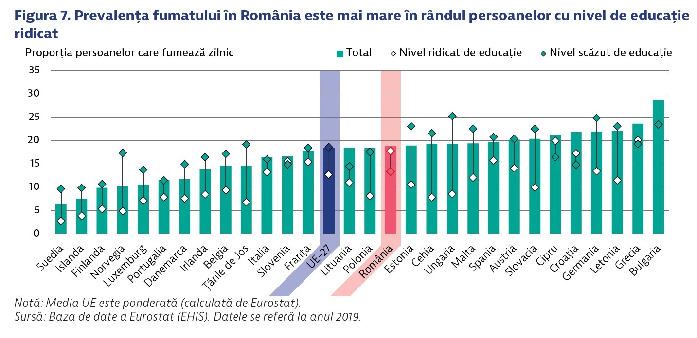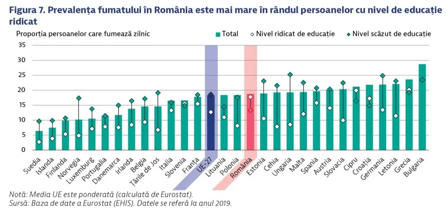 Rata fumatului de țigarete în rândul adulților din România se află în ușoară scădere din 2008, ajungând la 18,7% în 2019 și apropiindu-se astfel de media UE (18,4%). Rata fumatului în rândul bărbaților (30,6%) este de patru ori mai mare decât în rândul femeilor (7,7%), se arată într-un raport al Comisiei Europene publicat joi.