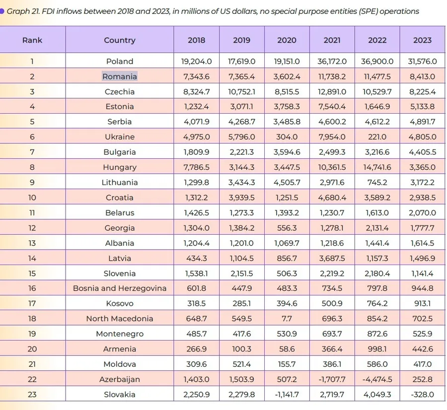 România se află pe locul al doilea în topul investițiilor străine directe în perioada 2018-2023, atrăgând 8,5 miliarde de dolari, potrivit raportului Investment Promotion realizat de Emerging Europe. Polonia a fost cel mai mare beneficiar al investițiilor străine directe, cu aproape 31,6 miliarde de dolari americani, urmată de România și Cehia.