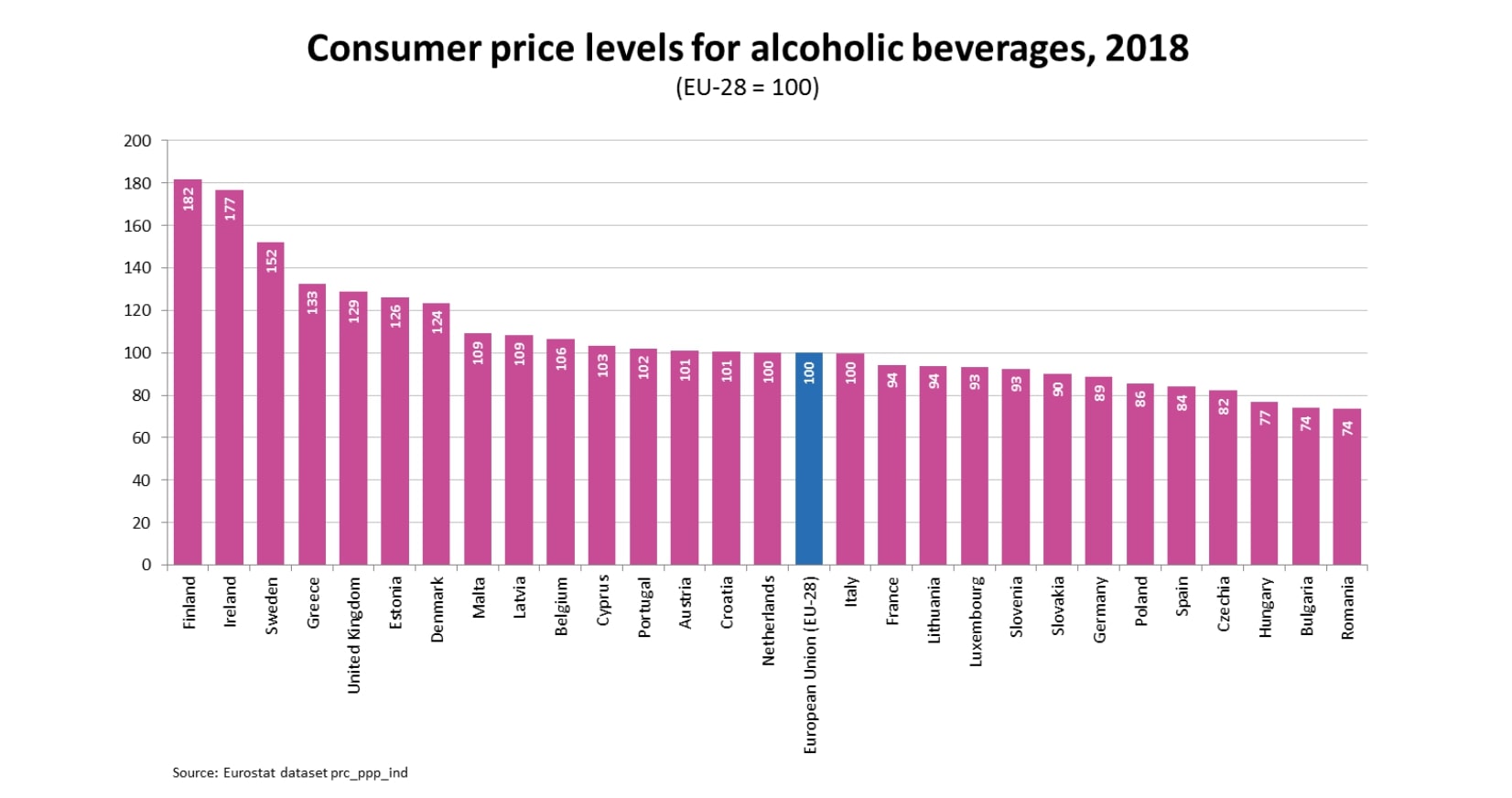 Conform acestor date, în rândul statelor membre UE, în anul 2018, preţul băuturilor alcoolice (băuturi spirtoase, vin şi bere) era cel mai mare în Finlanda (82% peste media din UE), Irlanda (77% peste medie) şi Suedia (52% peste medie), iar cel mai mic în România (26,4% sub media din UE), Bulgaria (26% sub medie) şi Ungaria (23% sub medie).