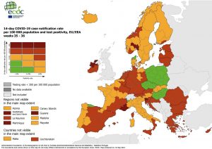 ECDC a stabilit 4 grade ale situației epidemiologice, colorate în funcție de cât de îngrijorătoare este situația în diferitele regiuni din Europa, în verde, portocaliu, roșu și roșu închis. România se situează acum la nivelul 3 din 4, de îngrijorare ridicată privind situația epidemiologică.