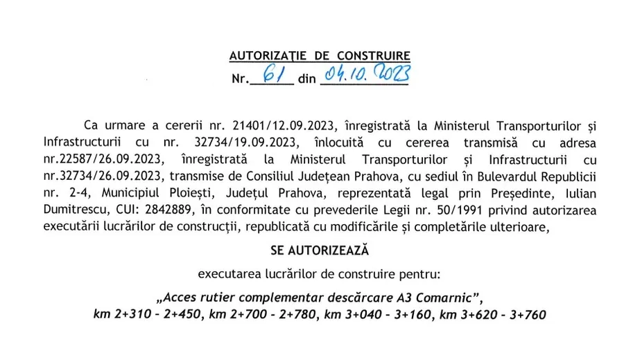 Ministrul Transporturilor Sorin Grindeanu, președintele CJ Prahova Iulian Dumitrescu și directorul CNAIR Cristian Pistol au „inaugurat” luni, 6 noiembrie, șantierul Centurii Comarnic, însă Ministerul Transporturilor a emis Autorizația de Construire pe doar 480 de metri din totalul de 6 kilometri ai centurii, arată datele publice pe care le-a consultat Economedia.
