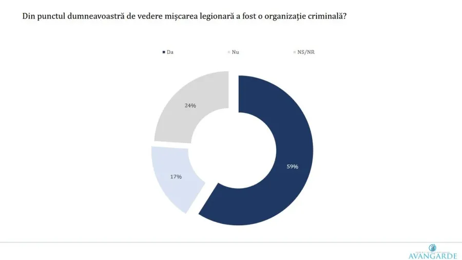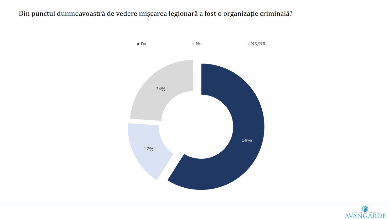 59% dintre români cred că Mișcarea Legionară a fost o organizație criminală, 17% nu cred acest lucru, iar 24% nu știu sau nu răspund, rezultă dintr-un sondaj de opinie autofinanțat, realizat de Avangarde, în perioada 19 – 24 august.