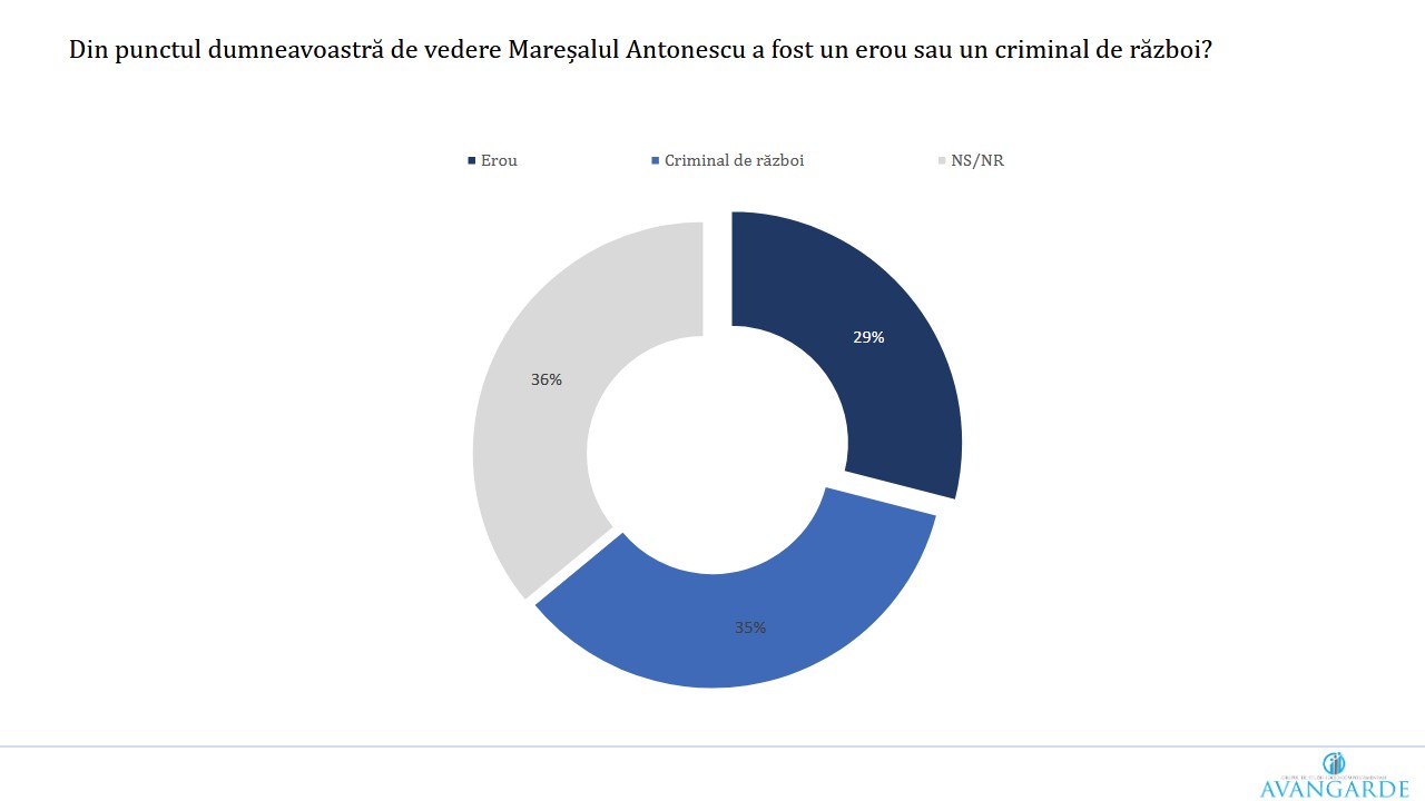 35% dintre cei intervievați cred că mareșalul Antonescu a fost un criminal de război, în timp ce 29% îl consideră erou. 36% nu știu sau nu răspund la întrebare.