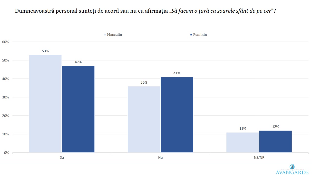 La întrebarea „Dvs personal sunteți de acord sau nu cu afirmația «Să facem o țară ca soarele sfânt de pe cer»?” 50% se declară de acord, 38% nu sunt de acord, iar 12% nu știu sau nu răspund.