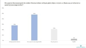 48% dintre cei intervievați cred că Uraina ar trebui să se așeze la masa negocierilor, 28% spun că ar trebui să lupte până la capăt. Pentru 43%, victoria Ucrainei înseamnă recuperarea teritoriilor așa cum erau înainte de invazia din 24 februarie. Pentru 32% înseamnă recuperarea teritoriilor, inclusiv Crimeea.