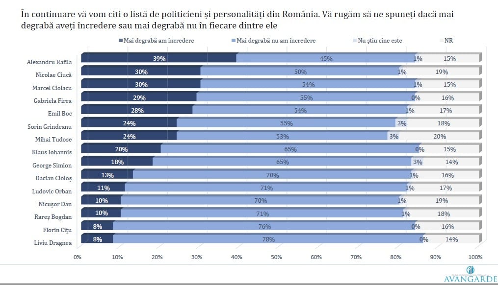 Alexandru Rafila, Nicolae Ciucă și Marcel Ciolacu se clasează pe primele trei locuri la încrederea românilor în ultimul sondaj Avangarde consultat de G4Media.ro. De remarcat că ministrul Sănătății, Alexandru Rafila, a crescut de la 37% (noiembrie) la 39% în plin val pandemic.
