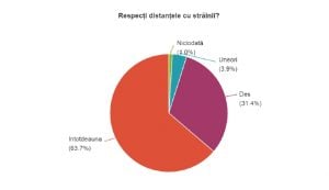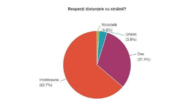 Chiar dacă doar 14% se consideră grupă de vârstă cu risc ridicat, de cele mai multe ori respectă măsurile sanitare impuse de guvern. Când întâlnesc persoane străine, majoritatea studenților români păstrează o distanță fizică (64% întotdeauna; 31% des). Respectarea regulilor este mai dificilă cu familia și prietenii fiindcă doar 14% păstrează o distanță întotdeauna, 28% des și 37% uneori.