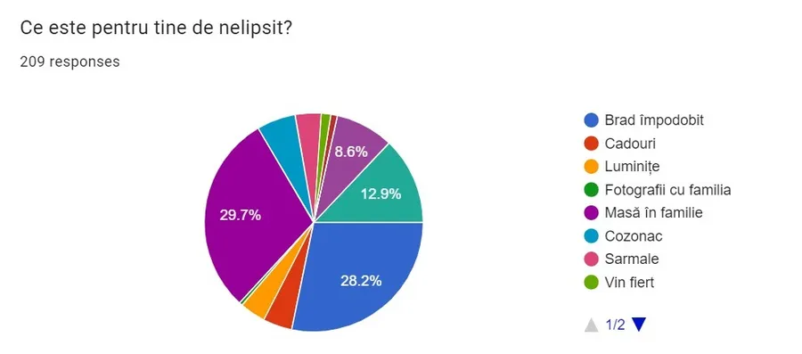 Sondajul s-a desfășurat online și a cumulat 209 răspunsuri. Menționăm că sondajul nu a fost făcut pe un eșantion reprezentativ, ci numai pe baza unui formular inclus în acest articol: SONDAJ „Nu e Crăciun fără…” / La ce te gândești prima dată când vine vorba de sărbători? / Votează în articol.