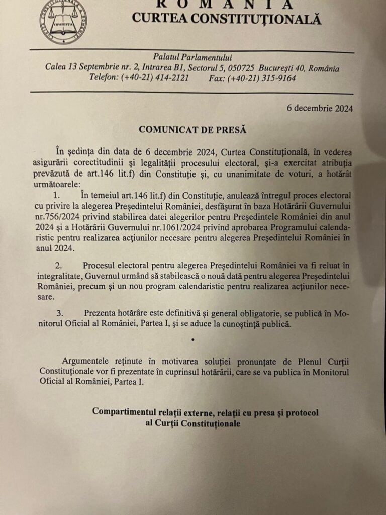 ”În temeiul articolului 146 litera f din Constituție, anulează întregul proces electoral cu privire la alegerea președintelui României”, se arată în comunicat. Art 146, litera f) prevede că CCR ”veghează la respectarea procedurii pentru alegerea Preşedintelui României şi confirmă rezultatele sufragiului”.