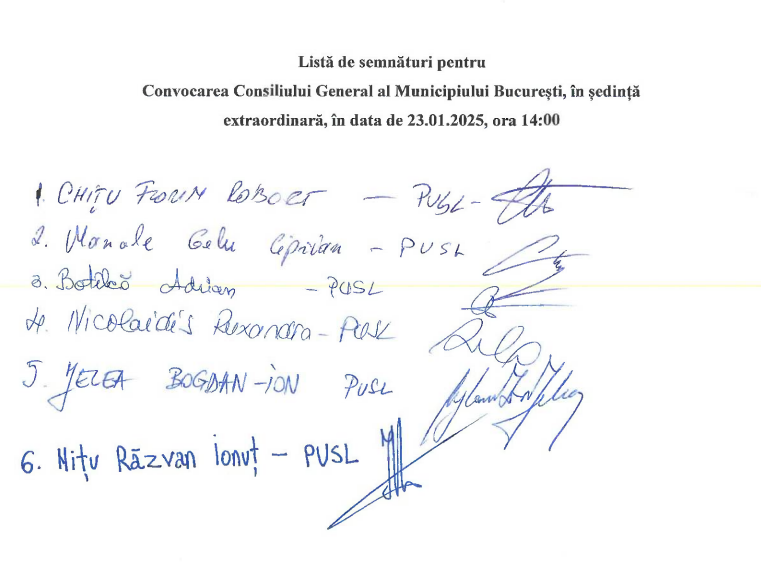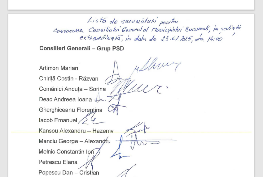 Listele de semnături de la PSD, PNL și PUSL pentru convocarea ședinței de CGMB pentru desemnarea viceprimarilor Capitalei:
