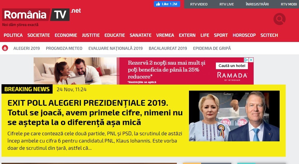 România TV, televiziunea fondată de Sebastian Ghiță, are ca articol principal la ora 20.00 un material cu titlul ”EXIT POLL ALEGERI PREZIDENŢIALE 2019. Totul se joacă, avem primele cifre, nimeni nu se aştepta la o diferenţă aşa mică”.