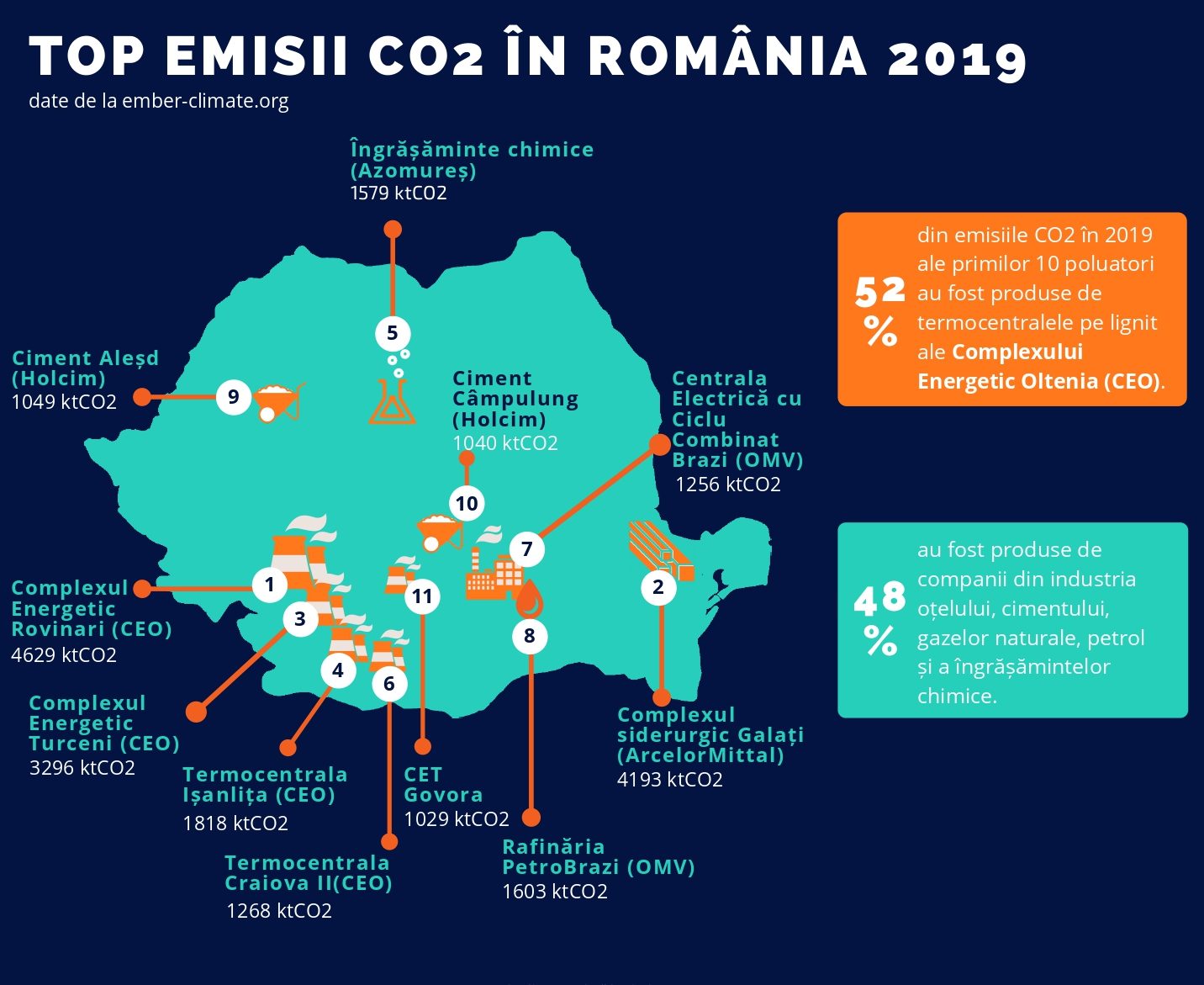 Topul celor mai mai mari zece emitenți de dioxid de carbon din România în 2019, realizat de think-tank-ul Bankwatch pe baza datelor Comisiei Europene, arată că locurile fruntașe sunt ocupate de termocentralele pe lignit administrate de Complexul Energetic Oltenia: Rovinari (1), Turceni (3), Ișalnița (4) și Craiova II (6).