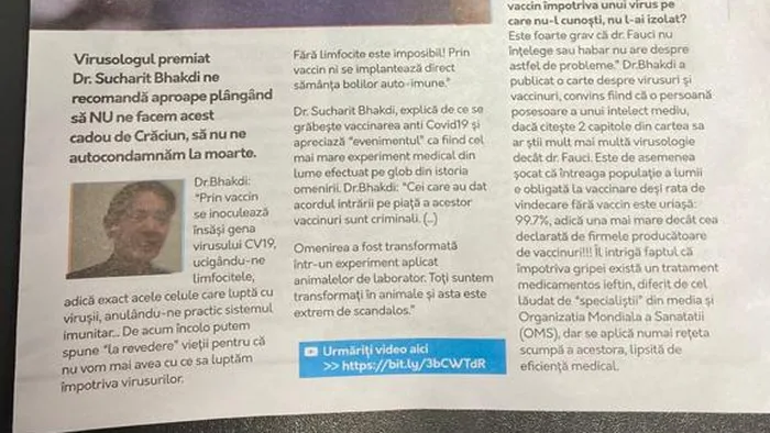 Broșura, sub denumirea „Adevărul despre nou vaccin ARN MESAGER mărturisit de oamenii de știință și duhovnici cu frică de Dumnezeu” este o compilație a unora dintre cele mai distribuite fake news-uri în online. Ea debutează cu opinia așa-zisului virusolog dr. Sucharit Bhakadi, potrivit căreia noul vaccin de tip ARN Mesager ar fi joaca de-a Dumnezeu, iar „prin vaccin se inoculează însăși gena virusului CV19cl, ucigându-ne limfocitele, adică exact acele celule care luptă cu virușii, anulându-ne practic sistemul imunitar… De-acum încolo putem spune „La revedere” vieții pentru că nu vom mai avea cu ce să luptăm împotriva virusurilor.”