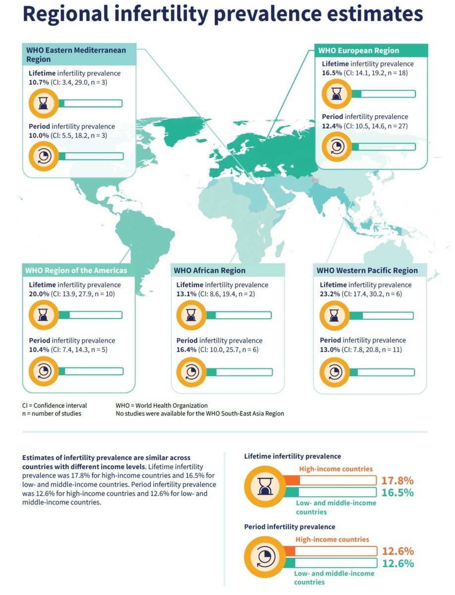 Potrivit raportului OMS, noile estimări arată o variație limitată a prevalenței infertilității între regiuni. Ratele sunt comparabile pentru țările cu venituri mari, medii și mici, ceea ce indică faptul că aceasta este o provocare majoră pentru sănătate la nivel global. Prevalența pe parcursul vieții a fost de 17,8% în țările cu venituri ridicate și de 16,5% în țările cu venituri mici și medii.