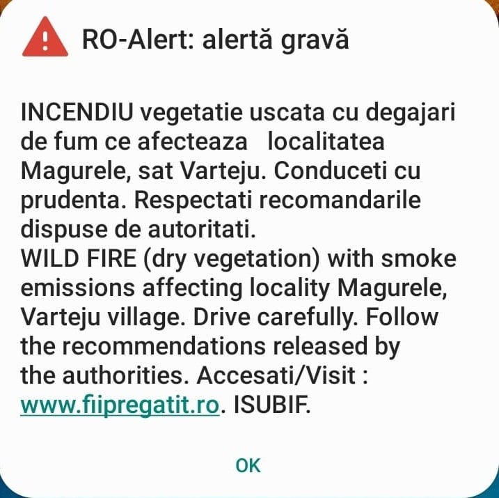 Ora 14.55: În urma acțiunilor întreprinse de echipajele de la fața locului, în acest moment nu există pericolul de extindere a incendiului către zona de case. Pentru informarea populației din zona afectată a fost emis și un mesaj RO-ALERT, a anunțat ISU.