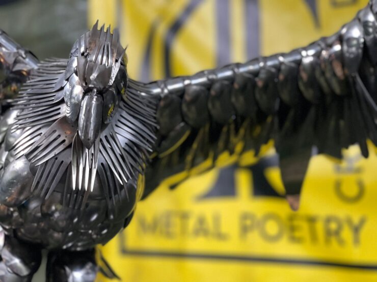 Cristina sculptează și sudează în fier obiecte de artă, toate făcute din piese moto.